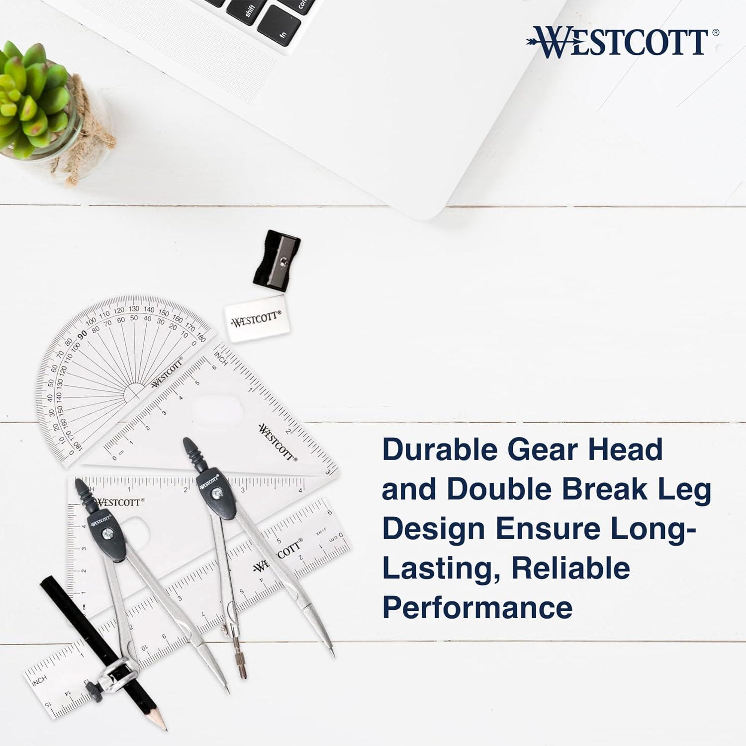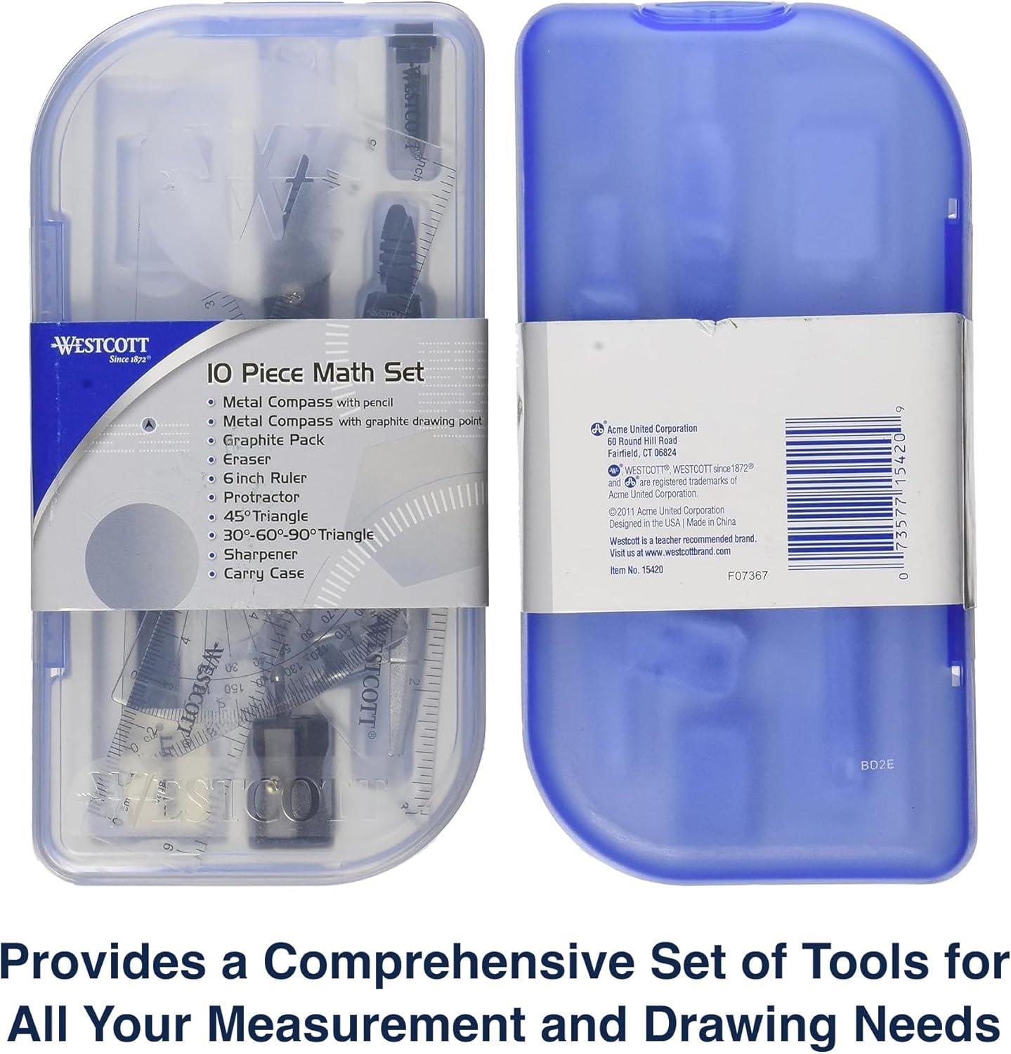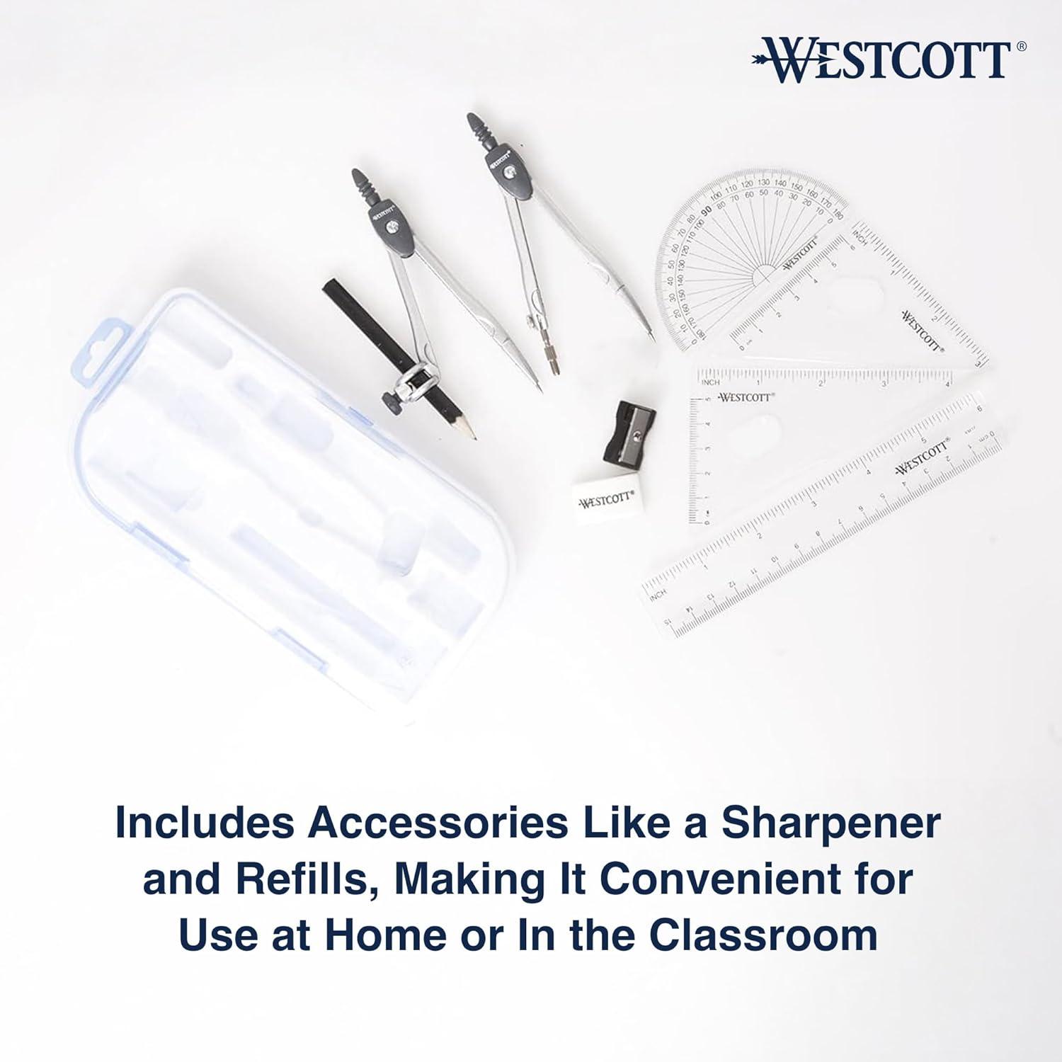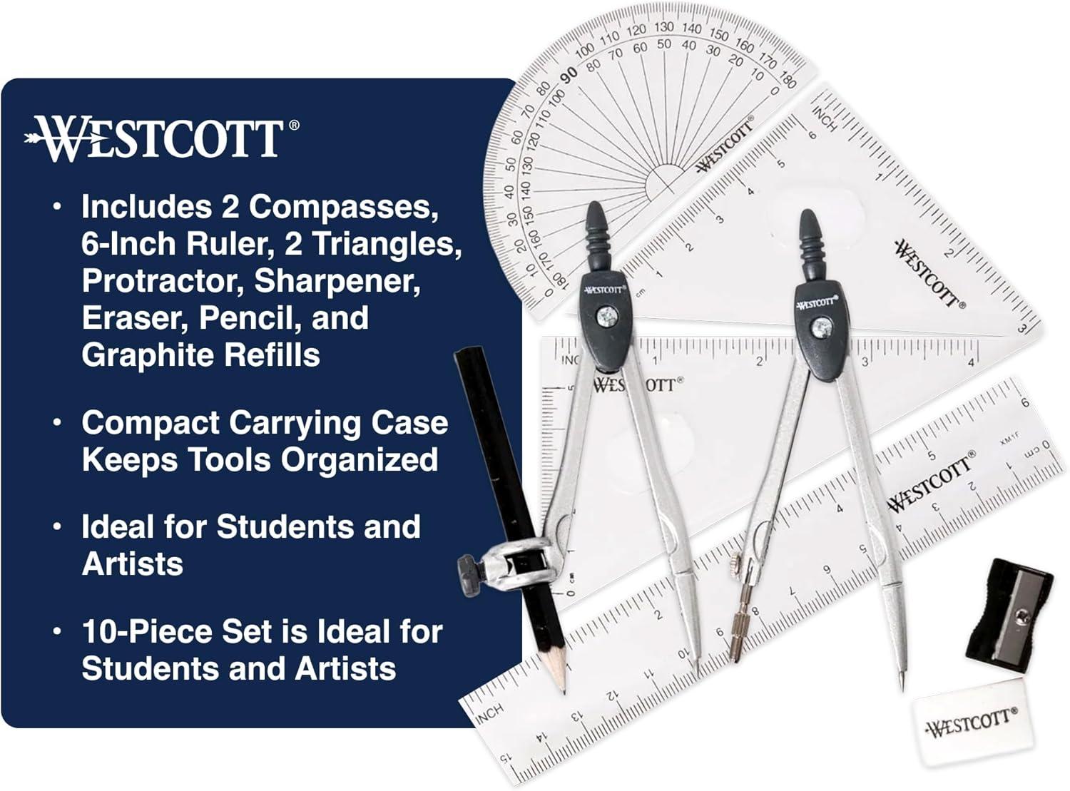 Introducing the Westcott Geometry Set, designed for precision and ease of use in both classroom and home settings. This comprehensive math set includes essential tools such as a protractor and compass set, clear ruler, two triangles, drawing compass, and pencil with graphite refills. The user-friendly gear head design and double break leg construction ensure reliable performance for students tackling geometry projects. The included Westcott protractor and compass enable accurate measurements, while the durable packaging serves as a convenient storage solution for all your math tools. Ideal for art and design students, educators, and homeschooling families, this geometry kit simplifies the study of geometric concepts. The compact and lightweight design makes it easy to transport, whether to school or when working on projects at home. Explore the world of geometry with confidence using this versatile drawing kit that meets the needs of students of all ages. Trust Westcott to provide you with a quality compass set for geometry that enhances your learning experience and helps you master geometric principles effectively. Make math fun and engaging with a reliable geometry set that equips you for success in your academic journey.