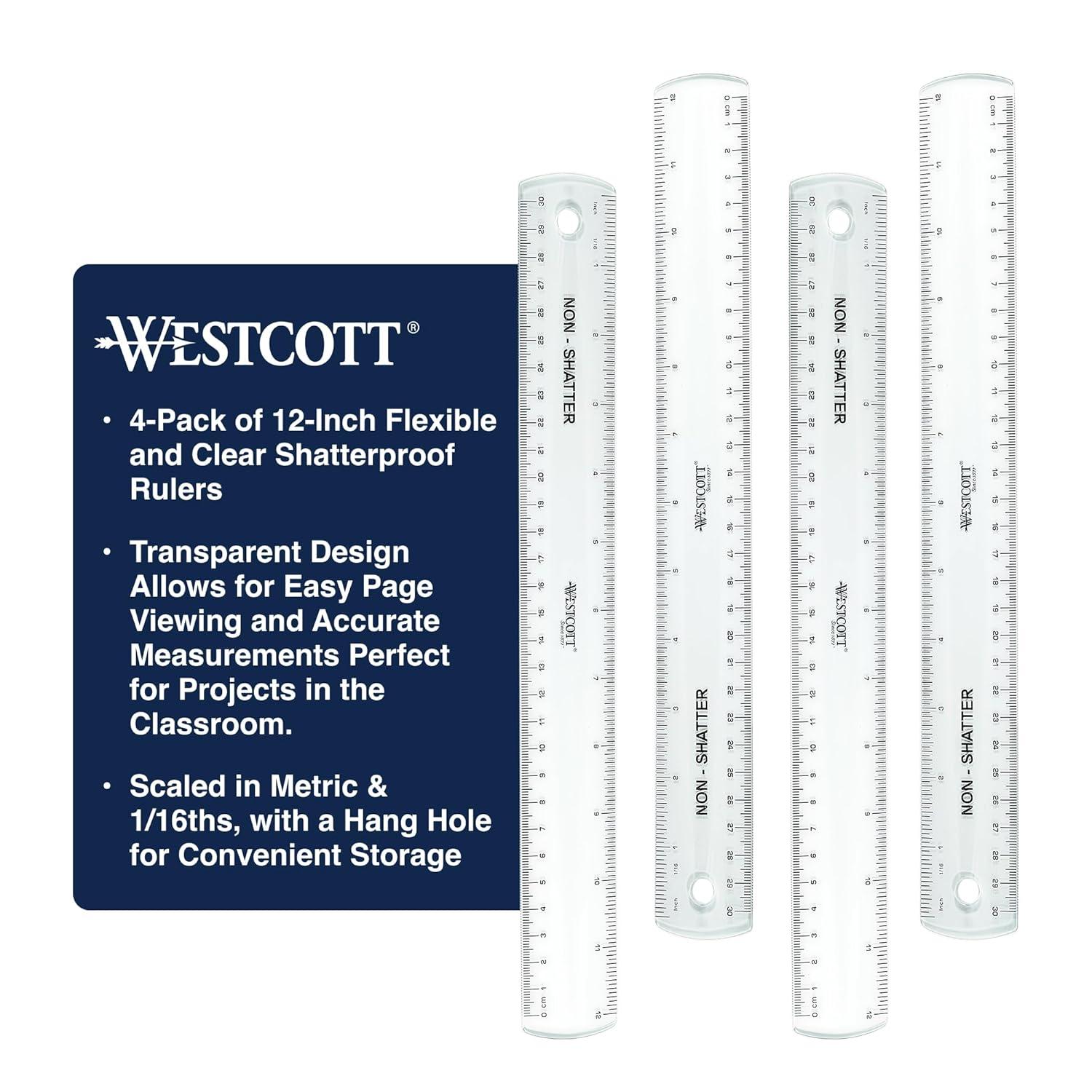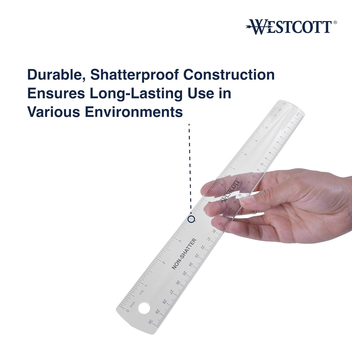 Introducing the Westcott 12-inch transparent ruler, a high-quality tool designed for both students and professionals. This versatile ruler combines practical features and durability, making it essential for school supplies or back to school supplies. Crafted from shatter-resistant materials, this shatterproof ruler 12 inch is flexible and capable of bending while returning to its original shape. The clear ruler features easy-to-read markings on both sides, including a straight edge scaled in sixteenths and standard metric measurements, ensuring precision in every project. Ideal for office workers, artists, architects, and hobbyists, this 12 inch ruler allows for effortless measuring and is perfect for a variety of tasks. With a convenient hang hole for storage, the Westcott ruler fits seamlessly into any workspace. Trust in this high-quality Westcott ruler to deliver precision and reliability in all your measuring needs. As part of your essential school supplies for kids, the 12-inch transparent ruler serves as both a functional tool and a stylish addition to your toolkit, making it a must-have among shatterproof rulers that withstand the test of time.