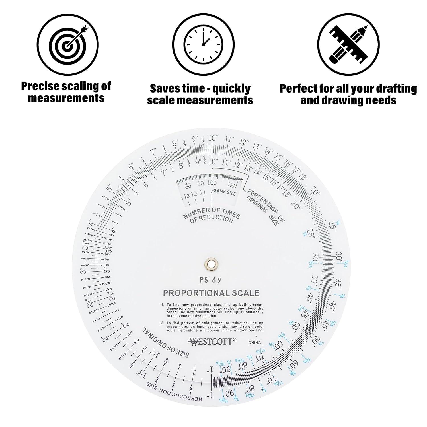 Westcott Proportional Scale features calibrations for fractions below an inch printed in a second color to calculate enlargements and reductions and maintain proportions when resizing. The perfect proportional scale wheel that fits your measuring needs. Westcott Drafting & Drawing Tools are some of the finest products of their kind for students and professionals. Our commitment to meticulous quality and cutting edge innovation in measurement and art materials has earned an unparalleled reputation.