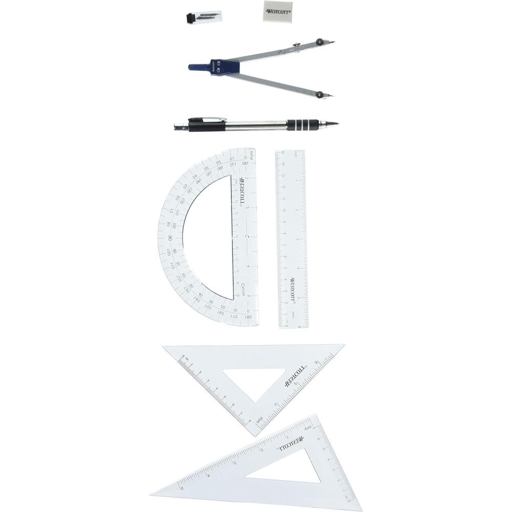 Compass. Graphite Refills. Transparent Protractor. Transparent Ruler. Transparent 60° Triangle. Product has a protection that inhibit the growth of bad odors.