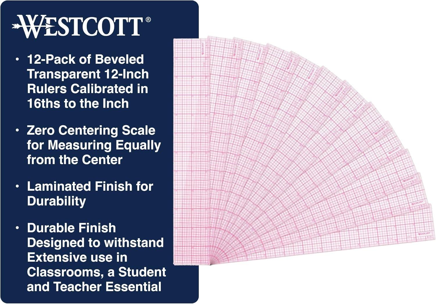 Westcott 8ths Graph Transparent Beveled Edge Ruler, Zero Centering Scale, Durable Laminated Finish,12-Inch, Measuring Tool for School, Office, Drafting, Sewing, Engineering, School Supplies, 12 Pack(12-Pack)