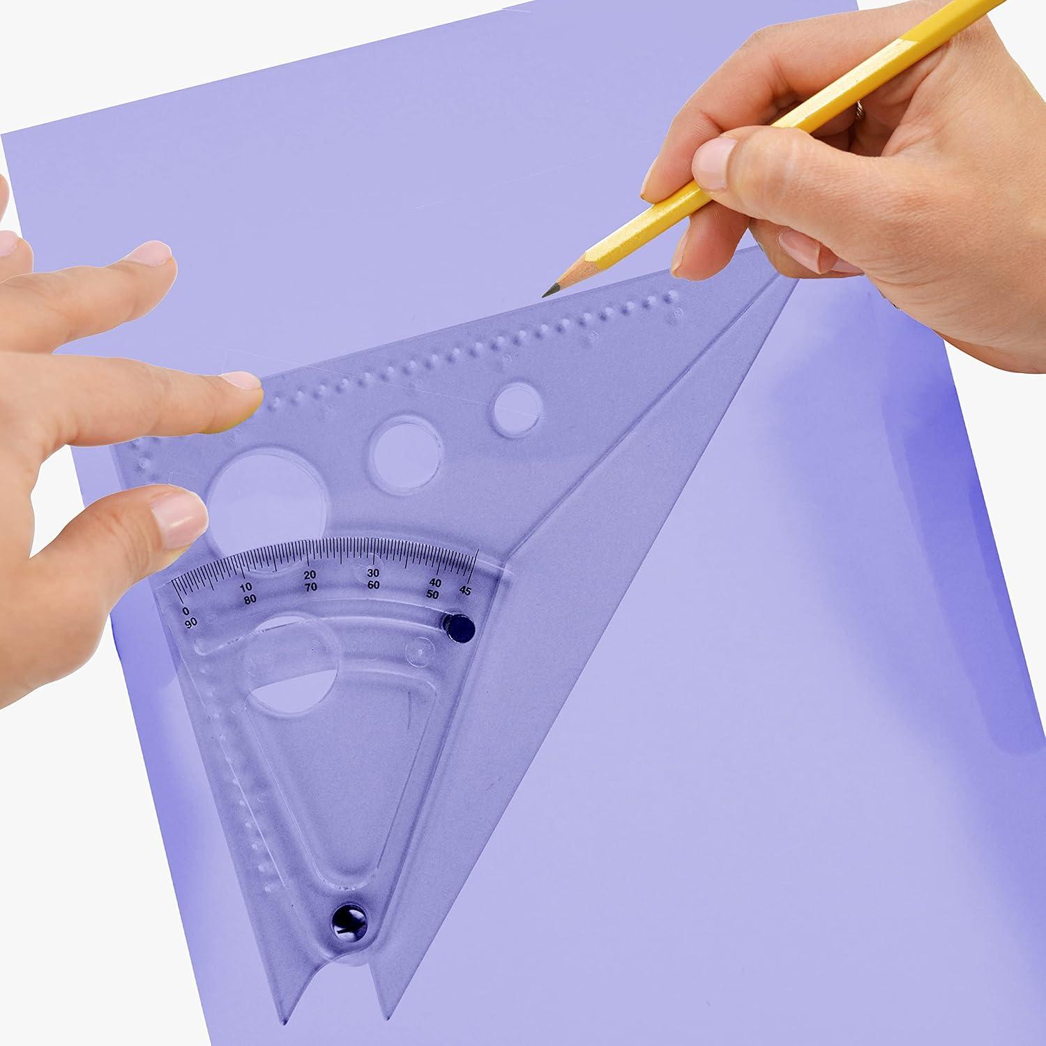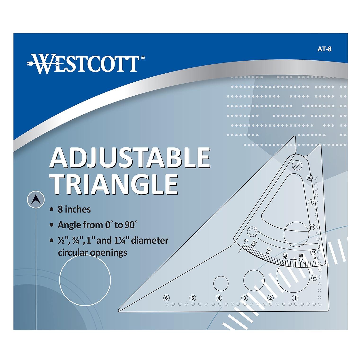 Westcott 8-Inch Adjustable Triangle Scale (AT-8) is a precise drafting instrument designed to measure and transfer angles from 0 to 90 degrees with repeatable accuracy. Dual graduations provide quick reference: inner arc shows one angle in degrees while the outer row reveals its complementary angle, supporting efficient layouts. Circular openings at 1/4-inch, 1/2-inch, 3/4-inch, and 1-inch enable circles and arcs with consistent radii. Transparent design uses clear material for easy visibility of underlying lines, aiding alignment and reducing parallax during drawing. Lightweight and durable, it fits drafting needs in classrooms and professional workspaces. This triangle ruler is a compact addition to any drafting kit and math kit, and the clear plastic ruler construction ensures long-term clarity. The drafting tool supports geometry-ready tasks, enabling precise angle tracing and circle construction. A triangle remains a practical reference for quick angle checks. A reliable triangular ruler serves students, engineers, architects, and designers in both instruction and practice.