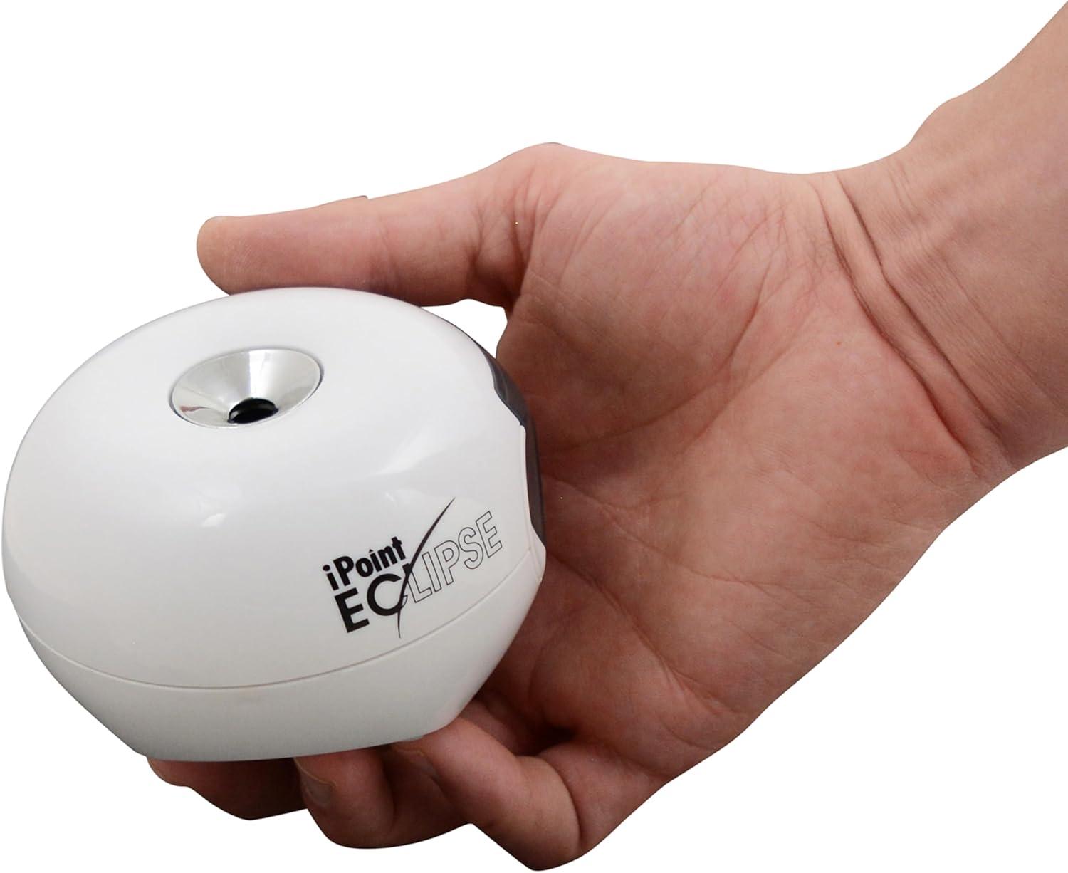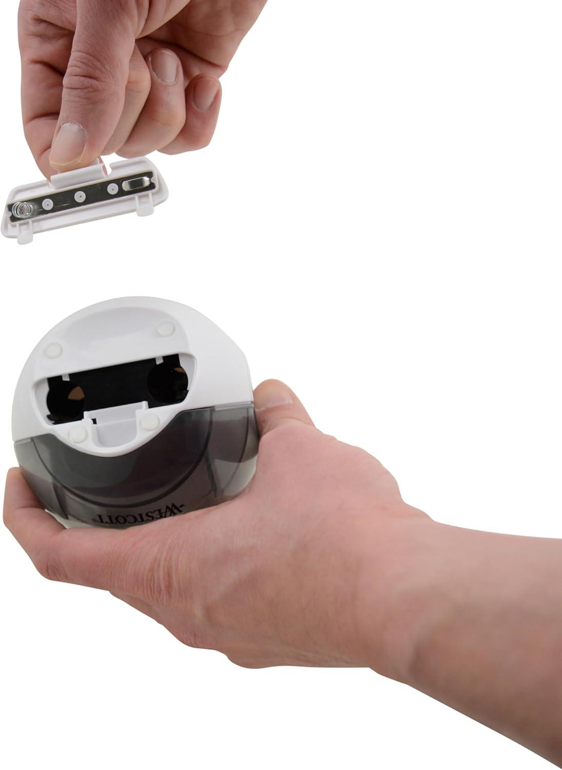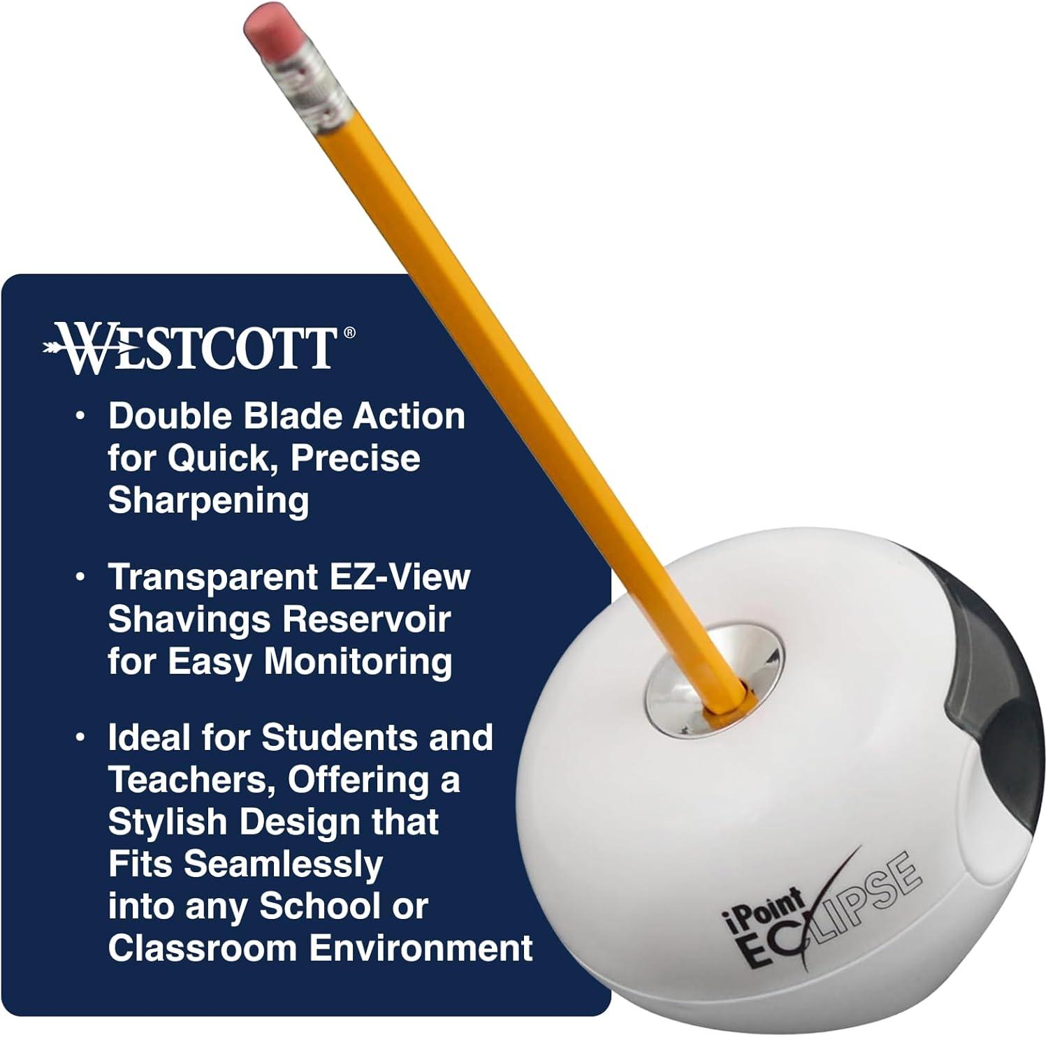 Westcott iPoint Eclipse Battery Pencil Sharpener, Unique Two-Blade Technology, EZ-View Reservoir, Requires 4 AA Batteries, White, for Home, Small Office, Classroom, Back to School, School Supplies