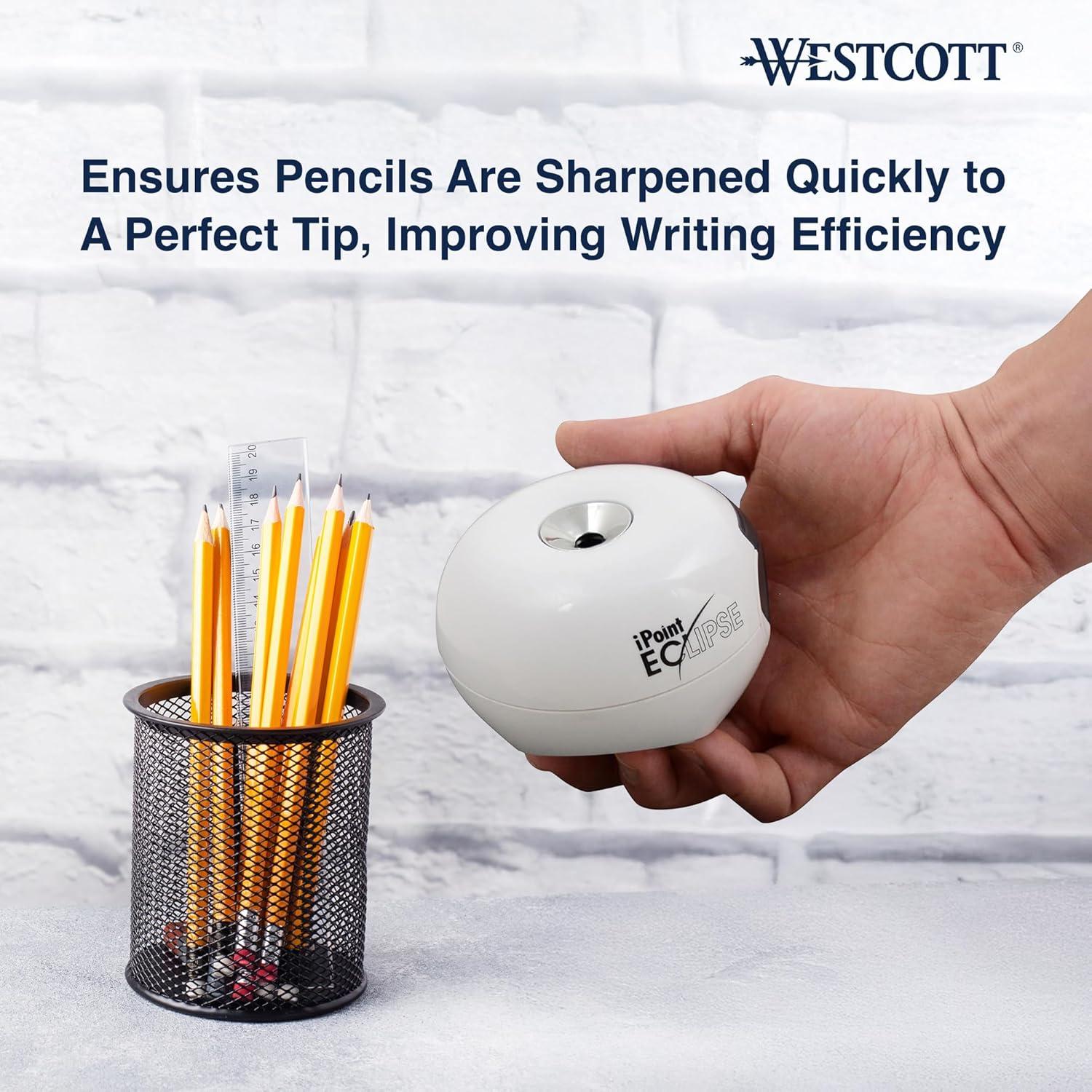 imageWestcott iPoint Eclipse Battery Pencil Sharpener Unique TwoBlade Technology EZView Reservoir Requires 4 AA Batteries White for Home Small Office Classroom Back to School School Supplies