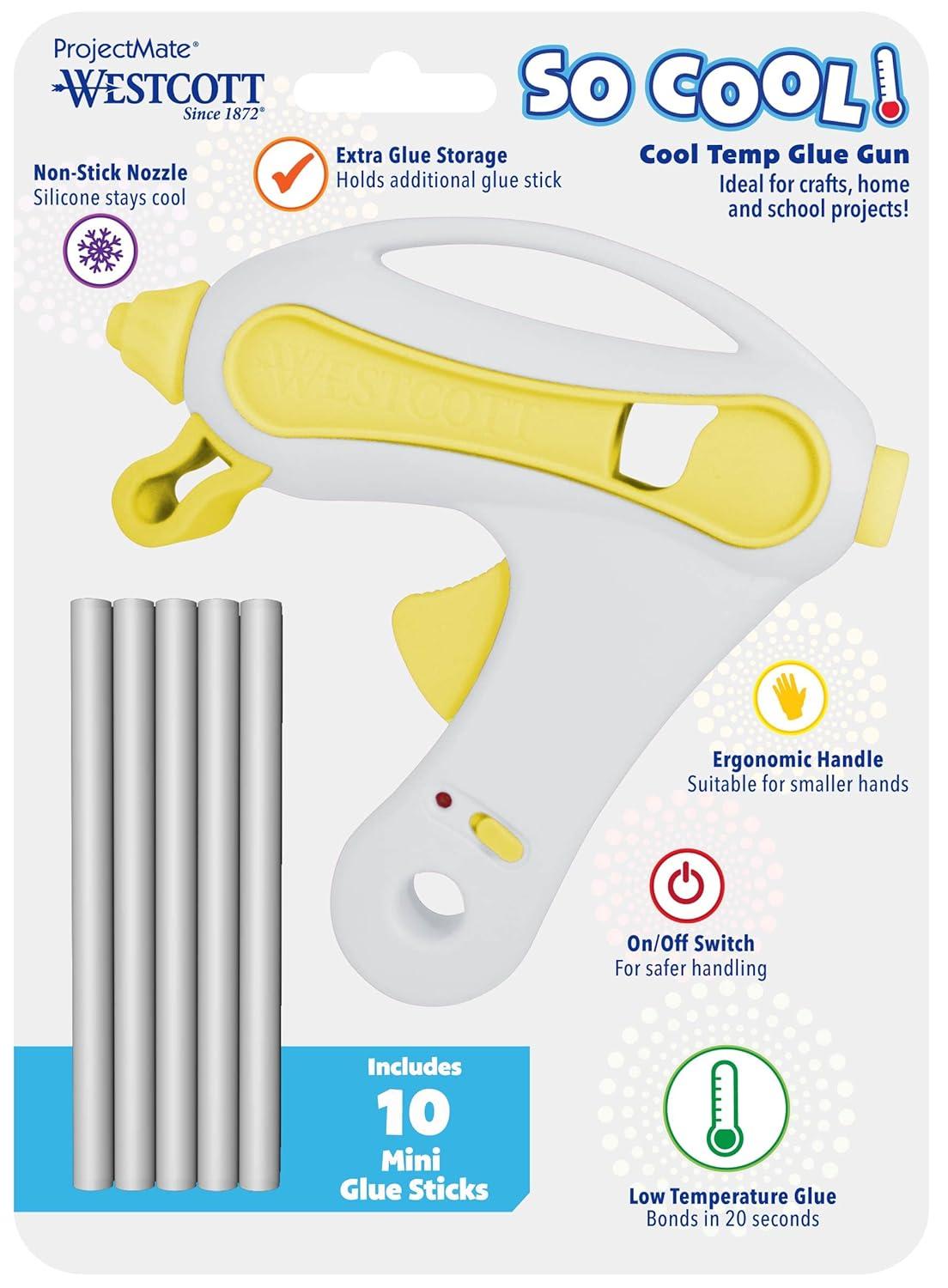 Westcott® “So Cool” low-temperature glue sticks are intended for use only with Westcott “So Cool” glue gun. The glue gun operates at 75°F (24°C) cooler than typical glue guns. The “cool” glue bonds in 20 seconds and is perfect for crafting at home or in school. Effective for bonding paper, foam, fabric, and other standard classroom materials.