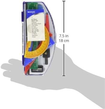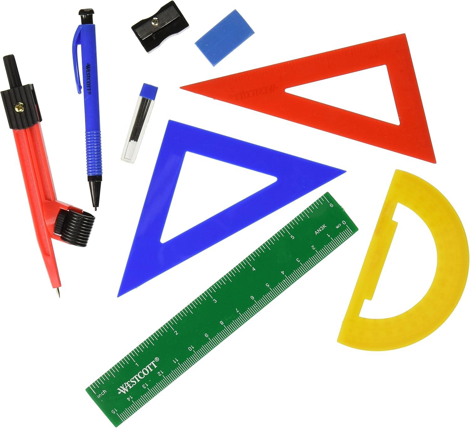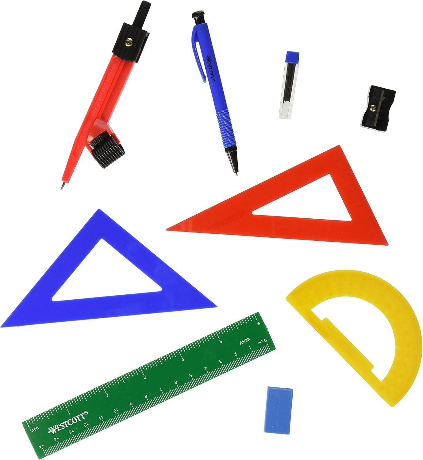The kit includes the following items: compass, mechanical pencil, lead refills, 6″ ruler, protractor, 45 degree triangle, 30-60-90 degree triangle, sharpener, eraser and 7″ pencil.